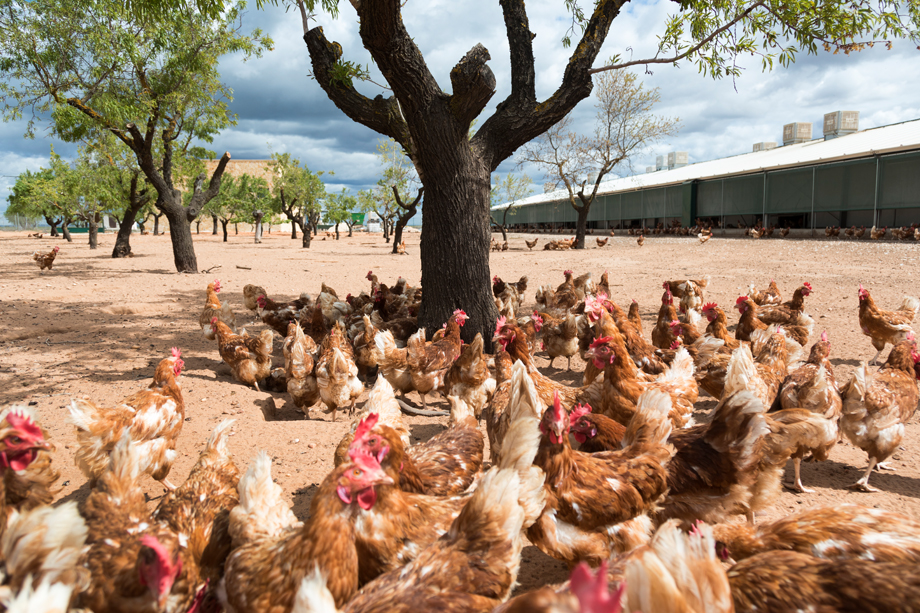 A cloud of golden feathers follows in the wake of Sandra Garcia as she carefully steps through a field of chickens on her farm in rural Spain.